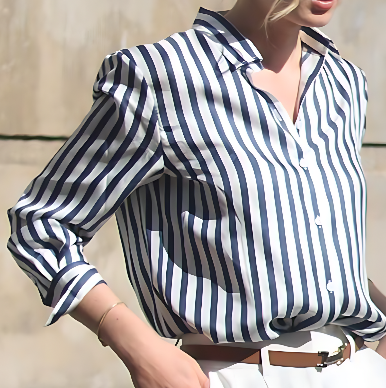 La blusa María combina elegancia y frescura con su diseño de rayas azules. Confeccionada en tejido ligero y suave, es perfecta para cualquier ocasión, desde un día casual hasta un evento semi-formal. Su corte clásico y versátil asegura comodidad y estilo en todo momento. ¡Un básico imprescindible para tu armario!